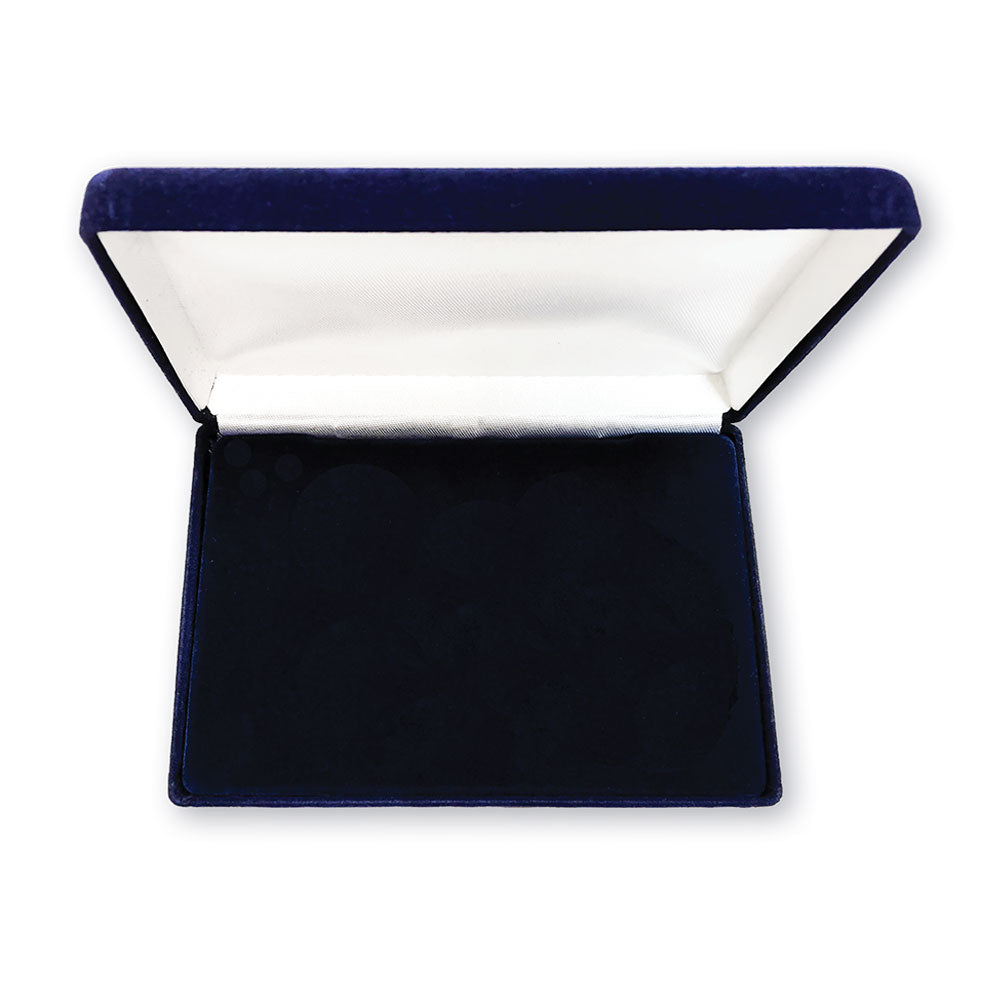 A four inch tall by six inch wide hinged box. The box exterior is covered with blue velvet. Items inside rest on a blue velvet bed. The lid of the box is lined in white satin. The boxes ship protected in a cardboard sleeve to prevent scratching.
